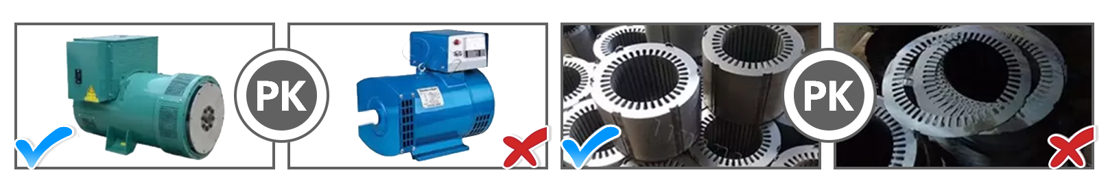 Máy phát điện không chổi than bằng dây đồng 100% Hoặc máy phát điện STAMFORD chính hãng. | Máy phát điện chổi than chất lượng thấp. | Sử dụng tấm thép silic cán nguội chất lượng cao | Sử dụng tấm thép silic cán nóng chất lượng thấp |